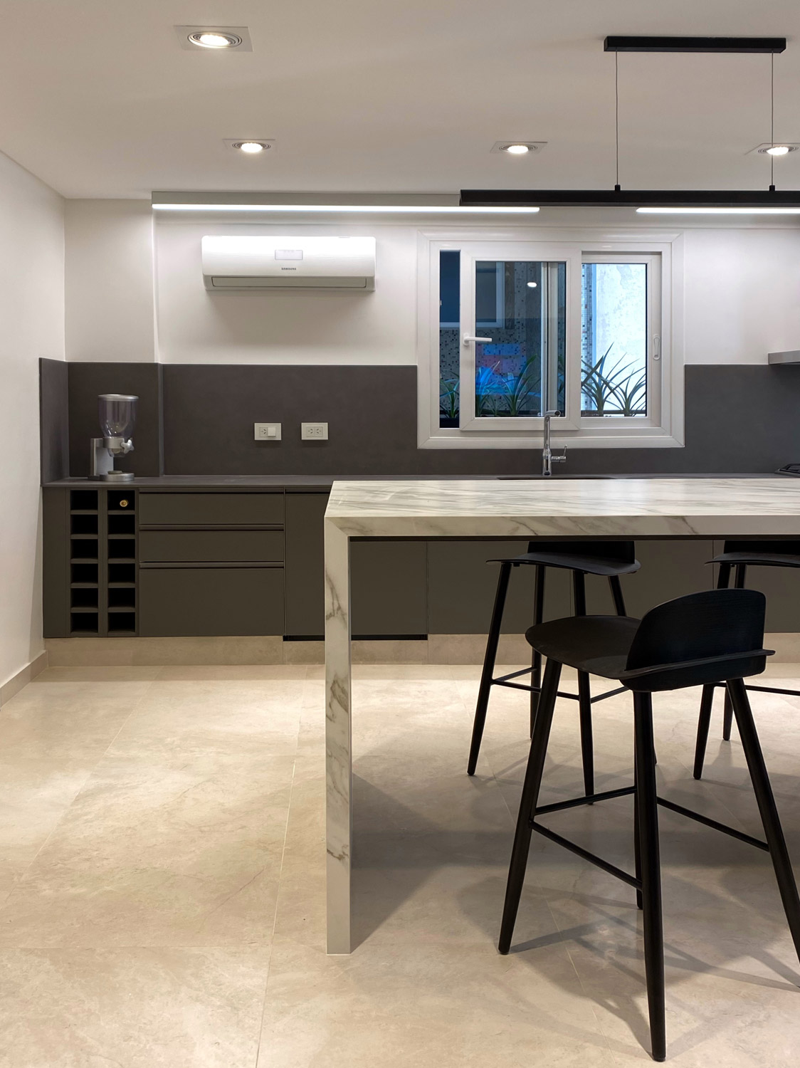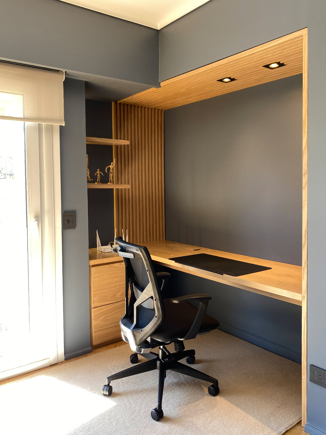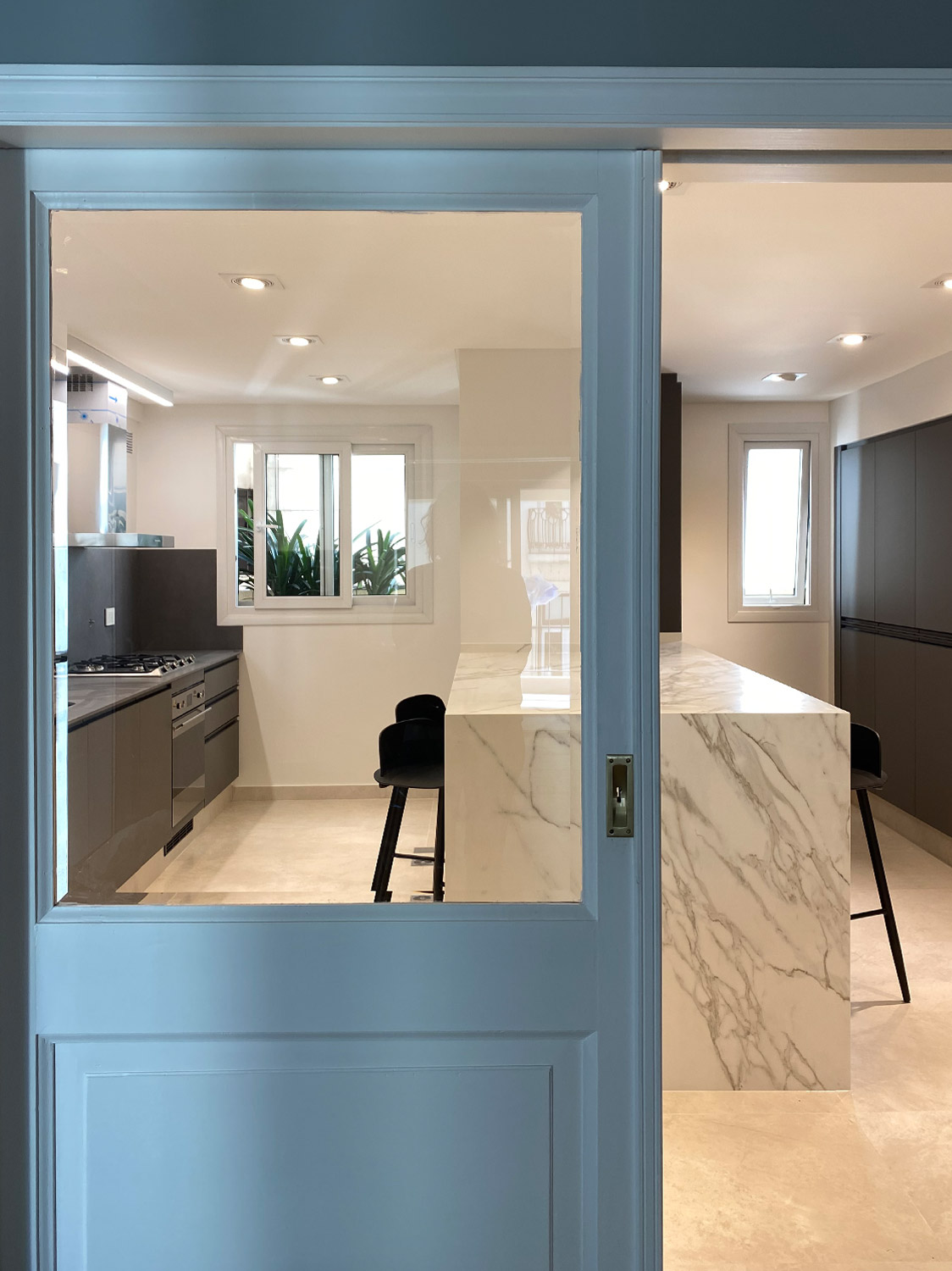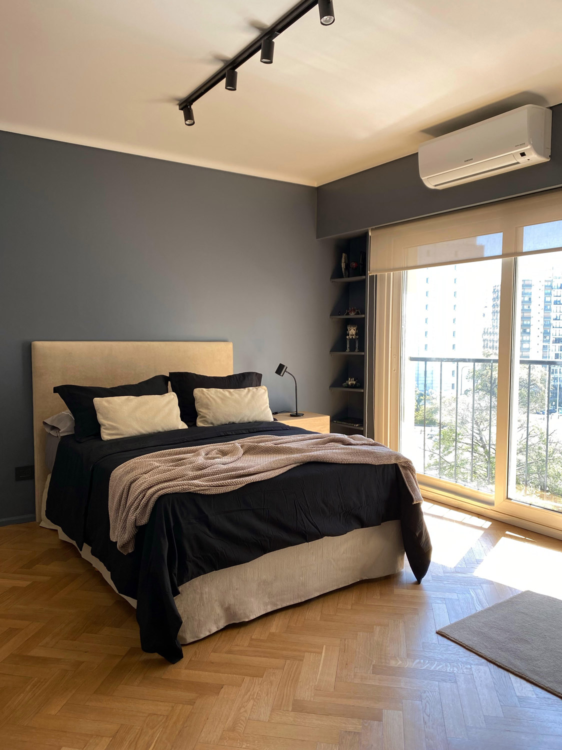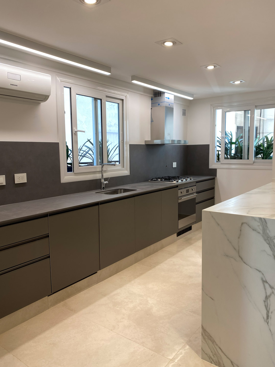 Proyecto de diseño interior para piso en edificio tradicional. Cambio completo de aberturas, re diseño de baños. Integración de la cocina, lavadero y el comedor. Restauración de solados en Roble de eslavonia. Diseño de iluminación. Diseño de placards, cortinados, mobiliario a medida. Definición de paleta de color y materiales, dirección de obra general.